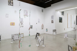 鷹取は、ドローイング、ペインティング、コラージュといった形式を用いながら、猥雑さ、装飾性、ユーモアが入り混じる濃密な画面を構築します。女性像を中心としたモチーフは、プリクラやファッション雑誌の切り抜きを集めたノートのように、鷹取のお気に入りの「混沌」を集めながら、鬱屈した表情やシニカルな視線を加え、その背景にあるストーリを想起させます。制作からしばらく遠ざかっていたと言う鷹取ですが、作品からはそのブランクを感じさせない描くことへの喜びを感じさせます。